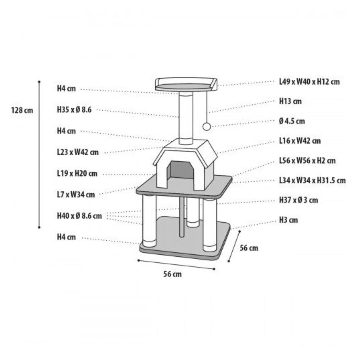 De krabpaal heeft een hoogte van 128 centimeter. De bodemplaat heeft een afmeting van 56 x 56 centimeter (L x B). Het huisje heeft een afmeting van 34 x 34 x 31,5 centimeter (L x B x H). De sisalpalen hebben een diameter van 8,5 centimeter.