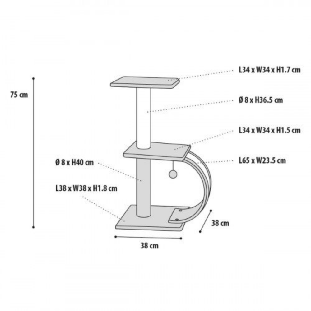 De krabpaal is 75 centimeter hoog. De bodemplaat heeft een afmeting van 38 x 38 centimeter. De sisalpalen hebben een diameter van 9 centimeter.