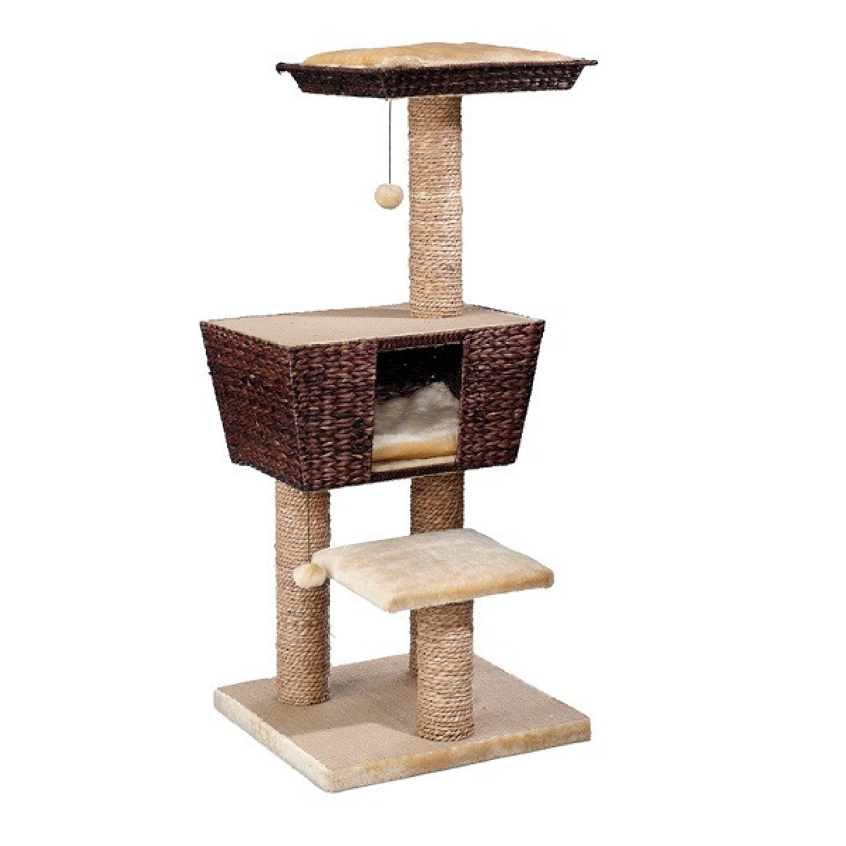 Het kattenhuis en het bovenste ligplateau zijn gemaakt van waterhyacint bladeren. Dit gewoven materiaal is soft en scheurvast. Verder bevat de krabpaal nog lekker zacht pluche. De pluche kussens in het kattenhuis, en het ligplateau zijn uitwasbaar. Op de palen zit jute helemaal verlijmd. Daarnaast zitten er nog 2 pluche balletjes aan de krabpaal.