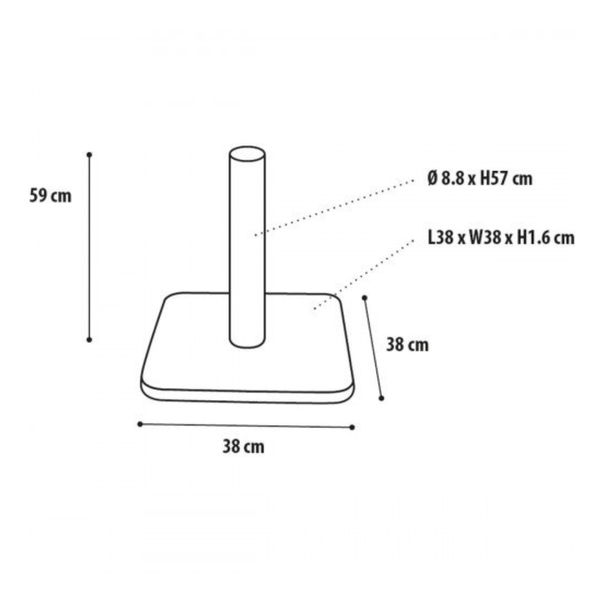 De krabpaal is 59 centimeter hoog. De bodemplaat heeft een afmeting van 38 x 38 centimeter (L x B).
