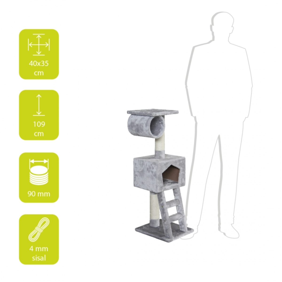 De krabpaal heeft een hoogte van zo’n 110 centimeter. De bodemplaat heeft een afmeting van 38 x 38 centimeter (L x B). De sisalpalen hebben een diameter van 8 centimeter.